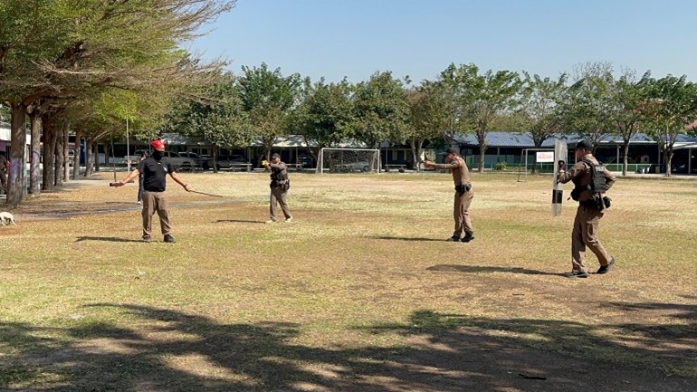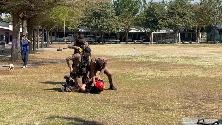 วันที่ 5 มีนาคม 2568 เวลา 09.00 น. พ.ต.อ.สิทธิพงศ์ สังข์แสง ผกก.สภ.เลาขวัญ สั่งการให้ พ.ต.ท.ณัฐพัชร์ พันธ์เจริญ รอง ผกก.ป.สภ.เลาขวัญ, พ.ต.ท.วิศิษฐ์ จตุราวิยสัจ สวป.สภ.เลาขวัญ พร้อมด้วย 20/รถยนต์, จราจร ร่วมกันซักซ้อมแผนเผชิญเหตุ กรณีคนร้ายบุกสถานศึกษา ได้แนะนำวิธีเอาตัวรอด เมื่อตกอยู่ในสถานการณ์ที่คับขัน ไม่ปลอดภัย (เช่น เหตุ Active Shooter บุคคลคลุ้มคลั่ง วิกลจริต หรือเหตุการณ์ที่อาจเป็นอันตราย หรือกระทบต่อชีวิตและทรัพย์สิน) โดยยึดหลัก Run Hide Fight “หนี ซ่อน สู้” ให้กับครู นักเรียน โรงเรียนบ้านหนองปรือ อ.เลาขวัญ จ.กาญจนบุรี